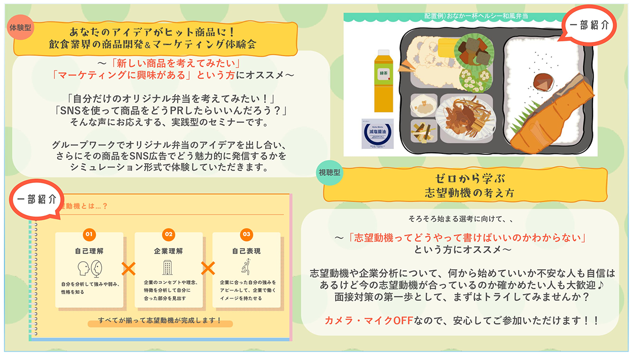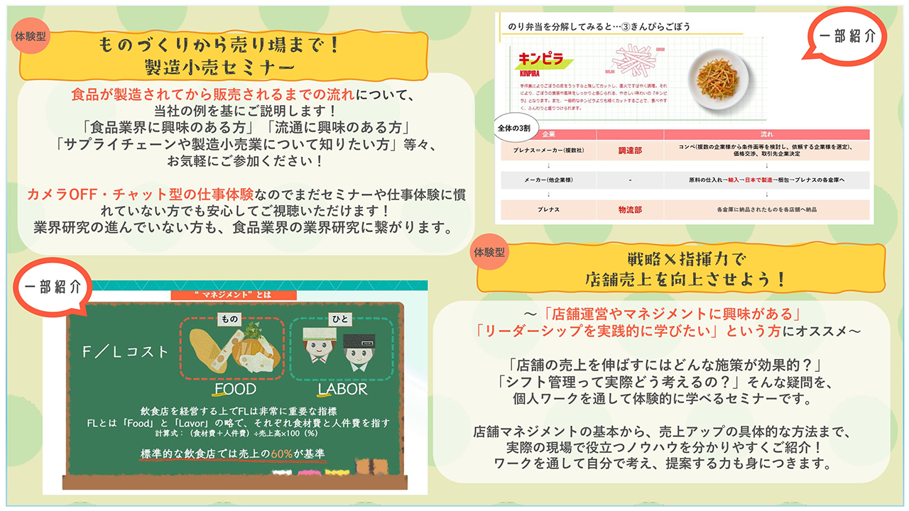 プレナスでは、夏と秋冬に仕事体験を実施。その内容は、店舗運営に関するものから商品開発まで幅広く、どれも実際の仕事内容に近いものです。そのため、プレナスのリアルな仕事を知ることができると同時に、店舗運営や食品メーカーの仕事に関する実践的な知識を学ぶことができます。また、仕事体験はすべてオンラインで開催しています。基本的に1dayで開催し、所要時間は約2時間ほどなので、学業と両立しながら気軽に参加することができます。